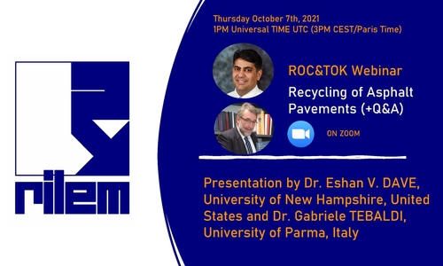ROC&TOK next week This is a friendly reminder of the next ROC&TOK webinar titled “ Recycling of Asphalt Pavements” on Thursday 7 October. It will be presented by Dr Eshan V. DAVE, University of New Hampshire, United States and Dr Gabriele TEBALDI, University of Parma, Italy. If you registered but are unable to attend, please send an email to assistant[@]rilem.org to cancel so someone else can attend in your place, thank you!