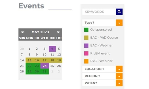 Here you can search by date, by region or by type (co-sponsored, EAC-PhD Course, EAC-webinar, RILEM event, RYC Webinar) all the conferences, webinars, and events in general promoted by RILEM.
