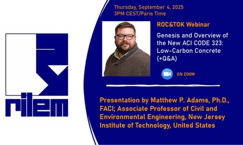 The next ROC&TOK webinar will be held on Thursday 4 September 2025, at 3 PM CEST/Paris Time. The speaker is Dr Matthew P. Adams, New Jersey Institute of Technology, United States, presenting "Genesis and Overview of the New ACI CODE 323: Low-Carbon Concrete". For more info and to register (webinar is free but registration is necessary), please follow this link.